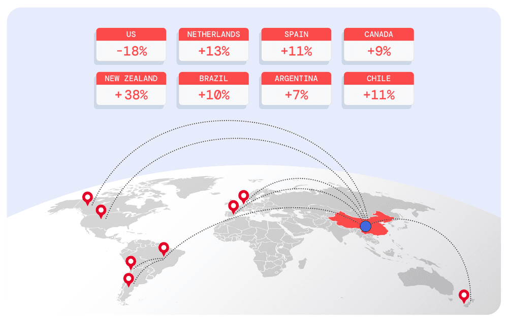 While US demand for inspections and audits in China fell -18% YoY in the 12 months of 2025, the drop was partly balanced by other Western buyers. QIMA data shows that many European brands still rely on China for textiles and apparel, with notable Q4 increases from Italy, Spain, Austria, the UK, and the Netherlands. Beyond Europe, inspection demand also grew in Canada (+9% YoY), Australia (+2% YoY), and New Zealand (+38% YoY).