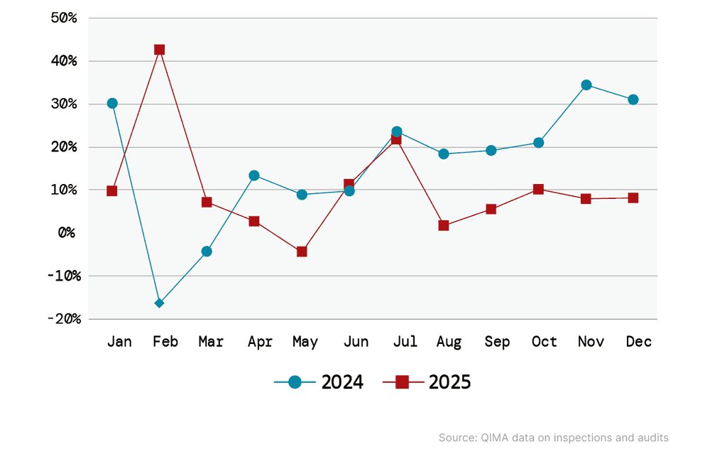 US procurement patterns shifted sharply throughout 2025, with peaks driven by front‑loading ahead of tariff hikes and troughs falling below 2024 levels. Despite the turbulence, QIMA data shows US procurement ending the year in positive territory, with inspection and audit demand up +9% year‑on‑year in the 12 months of 2025.